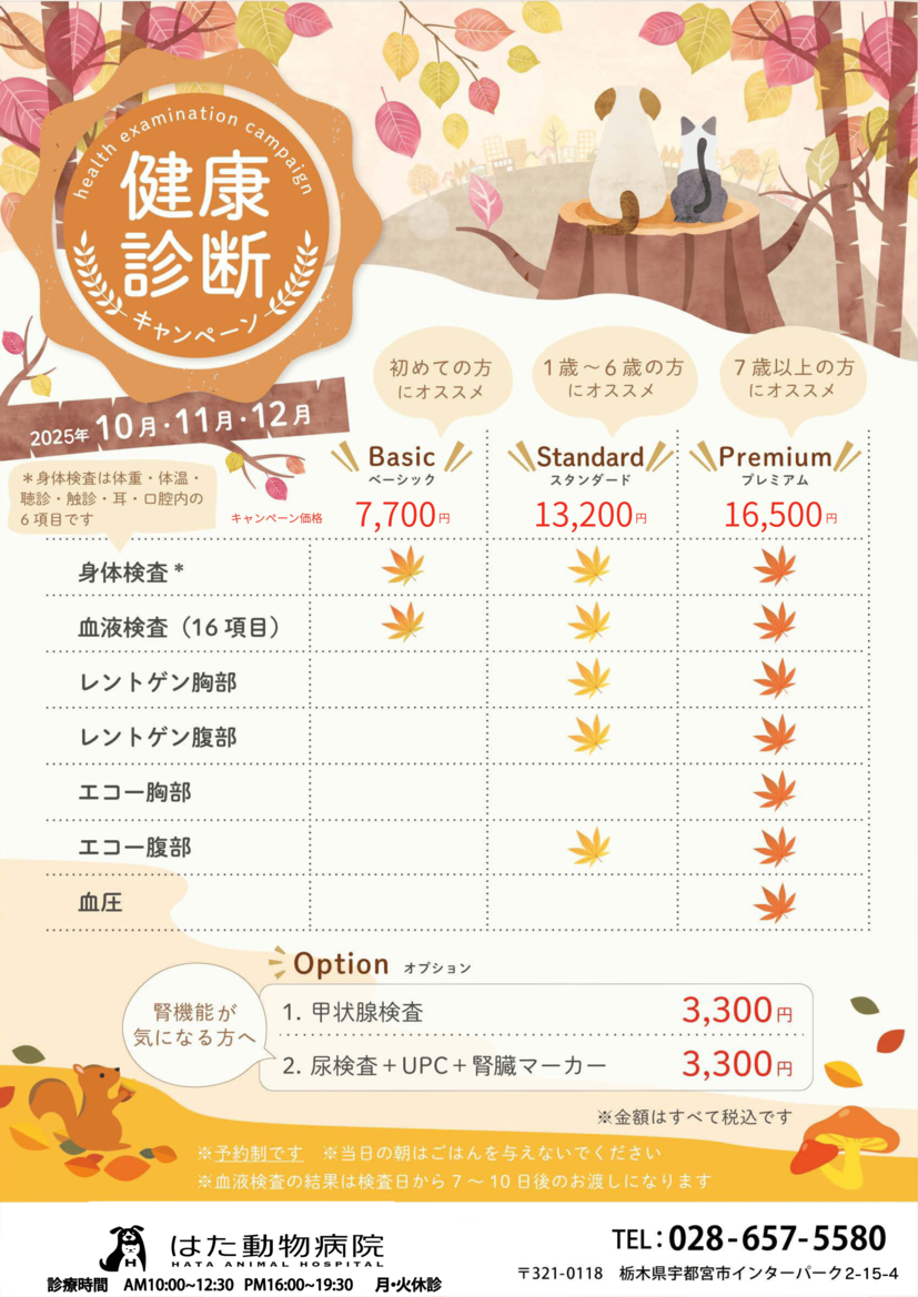 宇都宮市インターパークの「はた動物病院」です。 10月・11月・12月の3か月間、「健康診断キャンペーン」を実施いたします。 ご希望の方はお電話にてご予約のうえ、ご来院ください。料金など詳しい内容は、下記のご案内をご覧ください。 皆さまのご来院を...